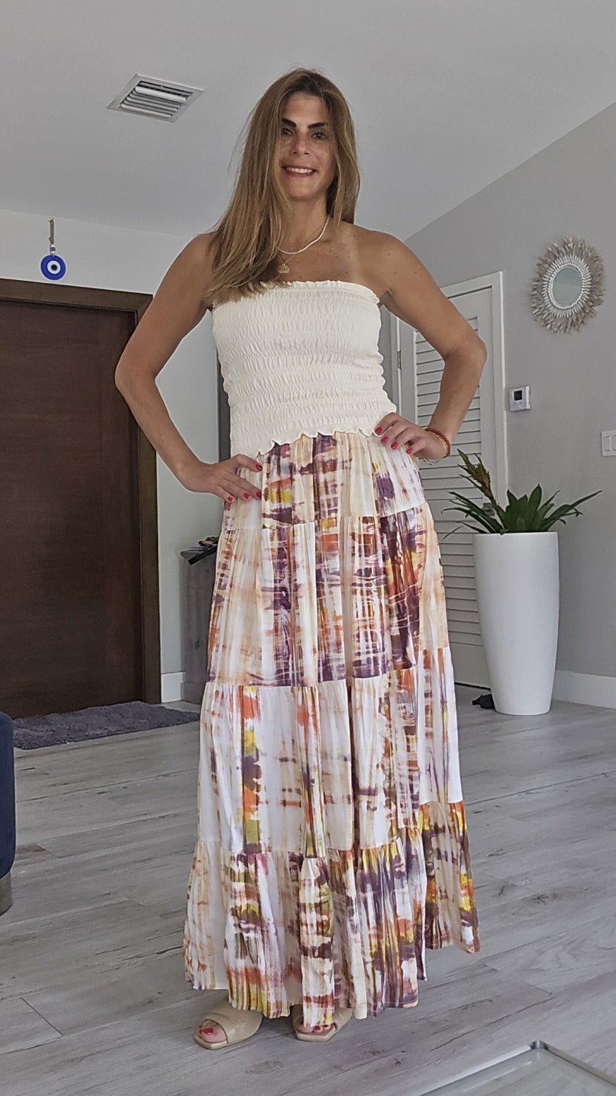 Elastic waist, full tiered midi skirt