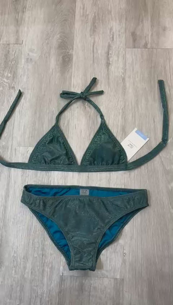 Discover our latest Sabz Kids Metallic Green Bikini from the new collection—truly stunning! Crafted from shimmering metallic fabric, it features a stitched triangle top with adjustable neck and back ties for a perfect fit. The bottoms offer moderate coverage, designed with Sabz’s slightly smaller sizing in mind. Perfect for stylish, on-trend swimwear in 2026, this bikini combines quality with a fashionable edge for kids.