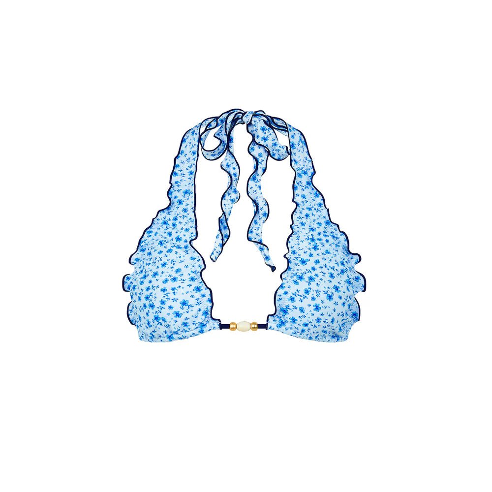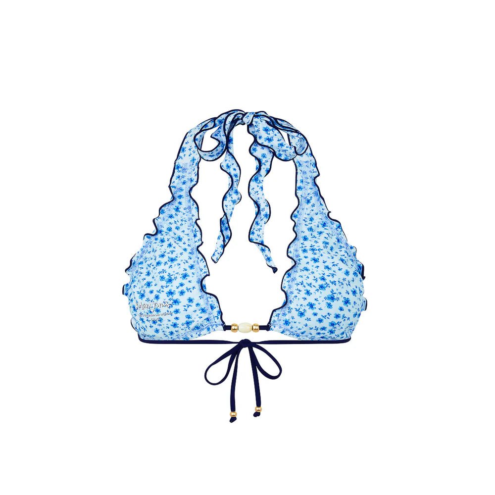 This longline halter bikini top features a beautiful 'lettuce edge’ trim for a textured, playful finish. With its flattering fit and vintage inspired shape, it’s your new must have for sun soaked beach days.