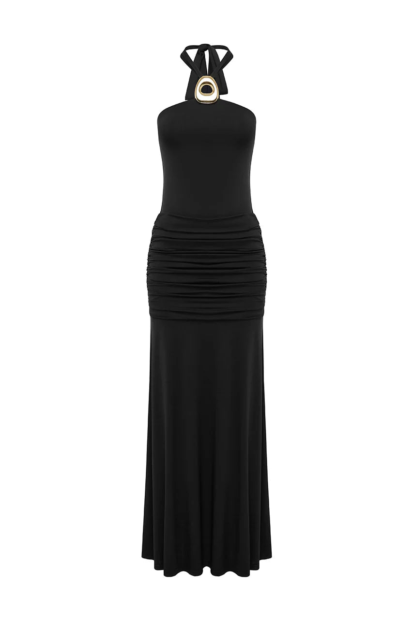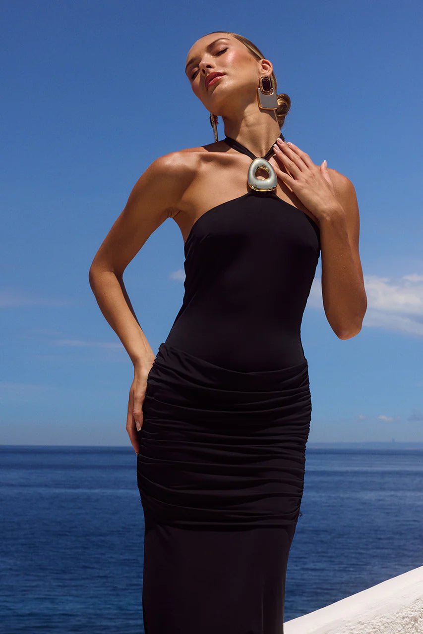 The Alola Halter Maxi Dress combines contemporary allure with refined sophistication. This slip-on design showcases a striking halter neckline and sleek silhouette, enhanced by strategic ruching at the hips and statement hardware for an elevated edge. The maxi length provides graceful coverage while the lined, stretch-infused fabric of 87% nylon and 13% elastane ensures a comfortable, flattering fit. An effortlessly chic piece that balances modern confidence with timeless elegance.