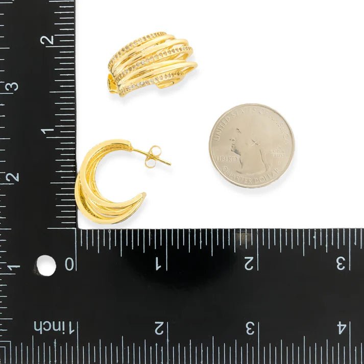 These exquisite earrings feature a stand-out design of interlocking hoops, creating a cascading effect. The central hoop is adorned with a row of shimmering cubic zirconia. Each earring is thoughtfully mirrored, ensuring the hoops cascade in opposite directions.