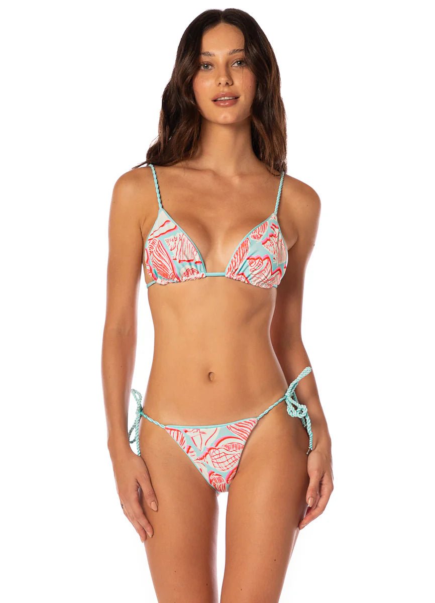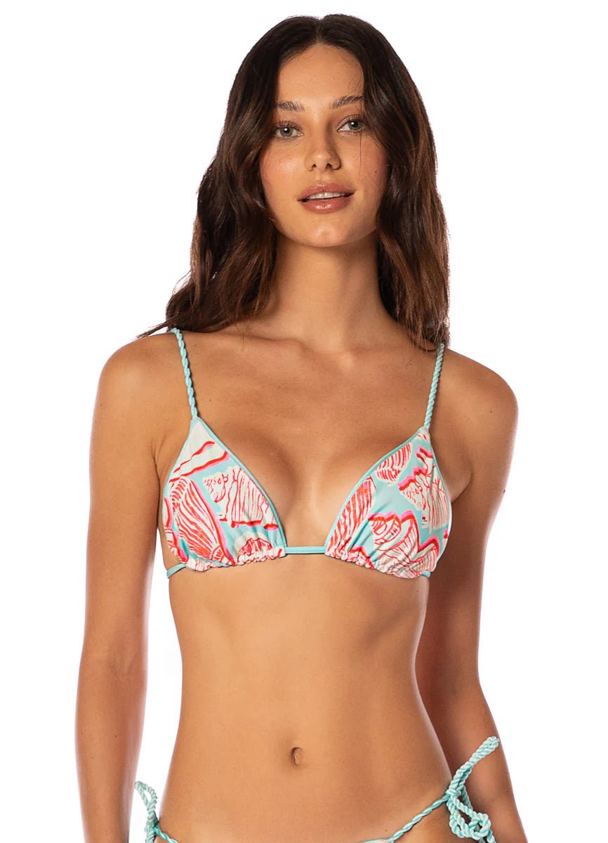 What's better than feeling the kiss of the sun's rays on your skin? Our Upbraid sliding triangle bikini top is the perfect complement to a hot day. It's got a beautiful braided detail, and hot tropical colors, plus a sweet reversible print, to make your day, every day.