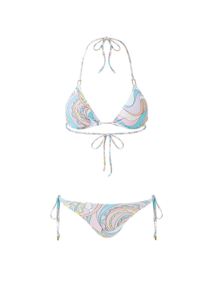 With its bold, graphic pattern and vibrant colour palette, the Cancun Bikini in ‘Riviera’ print provides a fresh update to your swimwear contingent. Crafted from premium Italian swim fabric, it provides SPF 50+ protection. A classic triangle top is elevated with removable pads and tie fastenings. Gold tone rectangular links at the base of the straps provide a signature Odabash detail, mirrored by branded cord ends on the tie side bottoms.