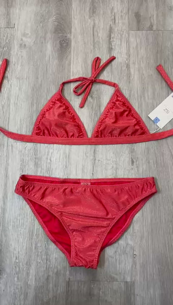 Discover our latest Sabz Kids Metallic Coral Red Bikini from the new collection—truly stunning! Crafted from shimmering metallic fabric, it features a stitched triangle top with adjustable neck and back ties for a perfect fit. The bottoms offer moderate coverage, designed with Sabz’s slightly smaller sizing in mind. Perfect for stylish, on-trend swimwear in 2026, this bikini combines quality with a fashionable edge for kids.