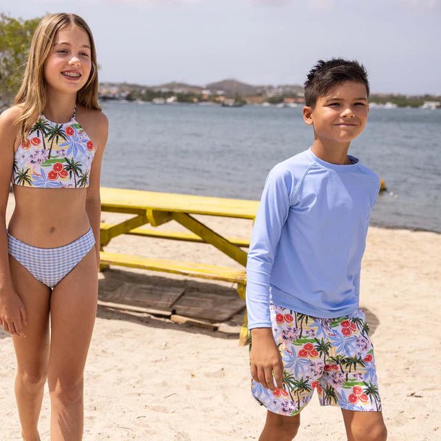 Big print, big personality. The Ciao Paradiso Swim Shorts are made for boys who bring the energy, featuring our boldest summer print yet, packed with palms, citrus, and sun-drenched Mediterranean colour. Made from UPF50+ recycled fabric with an elastic waistband, functional drawcord, and our inbuilt comfort liner to keep things comfy and chafe-free.